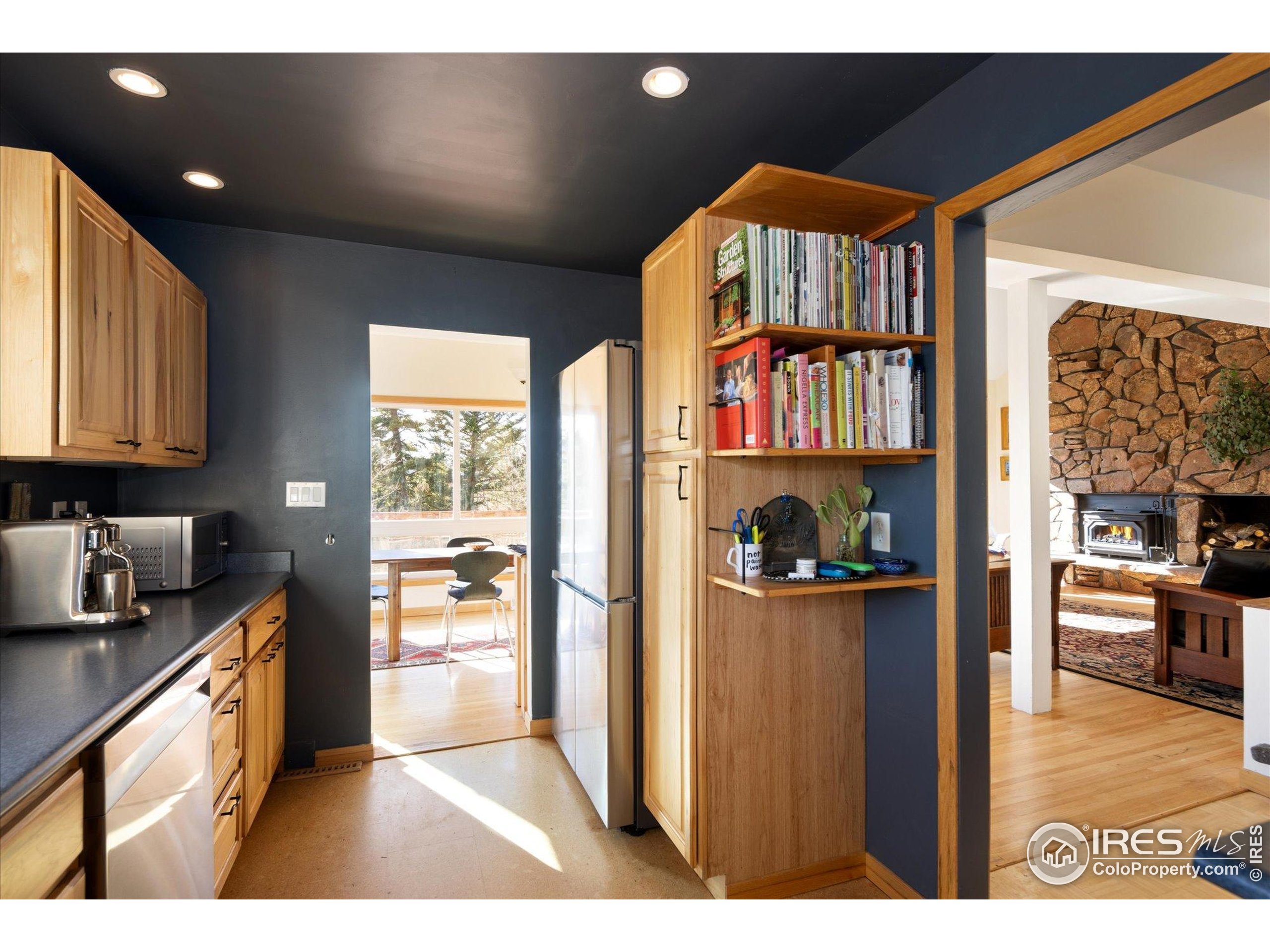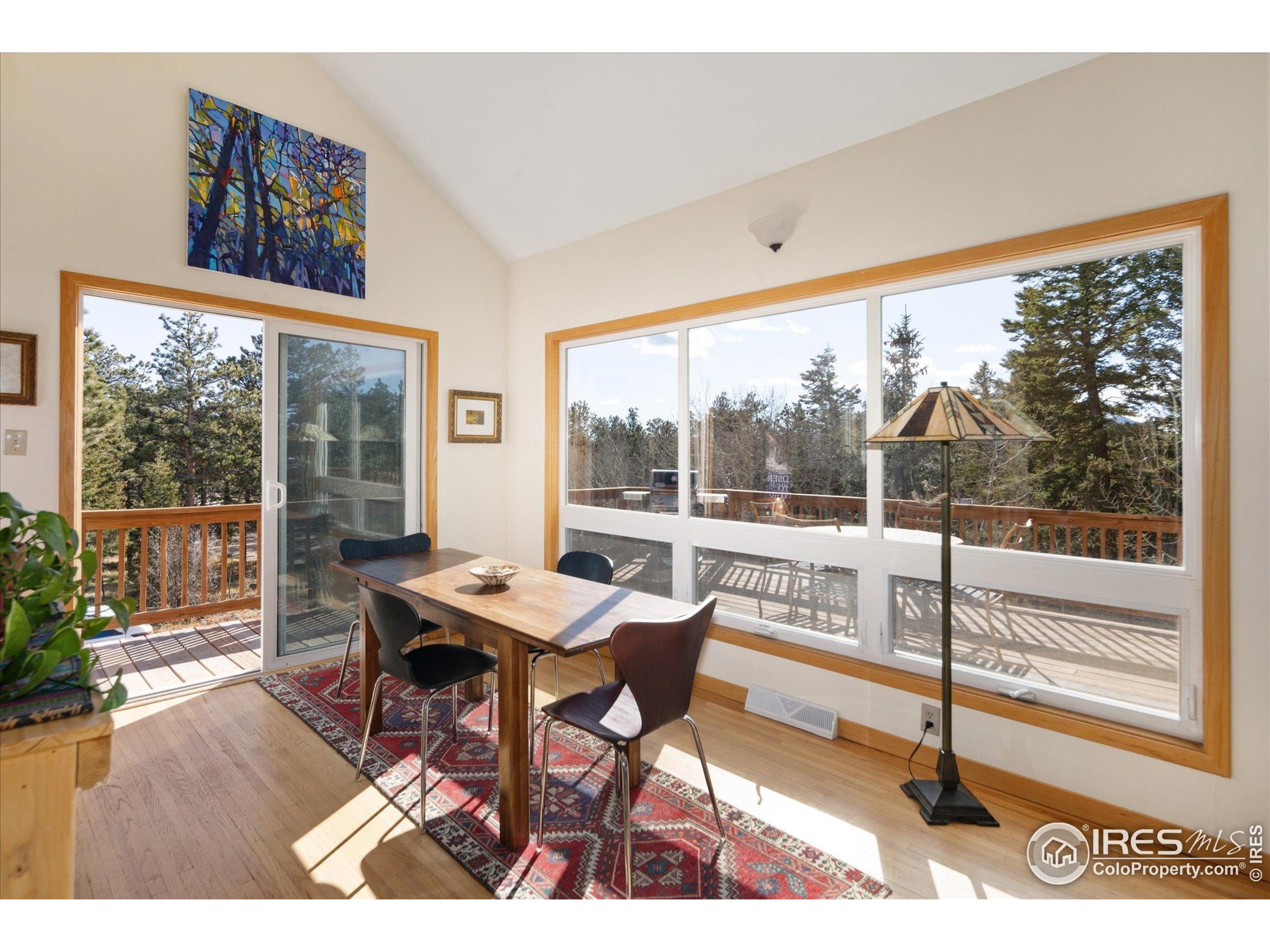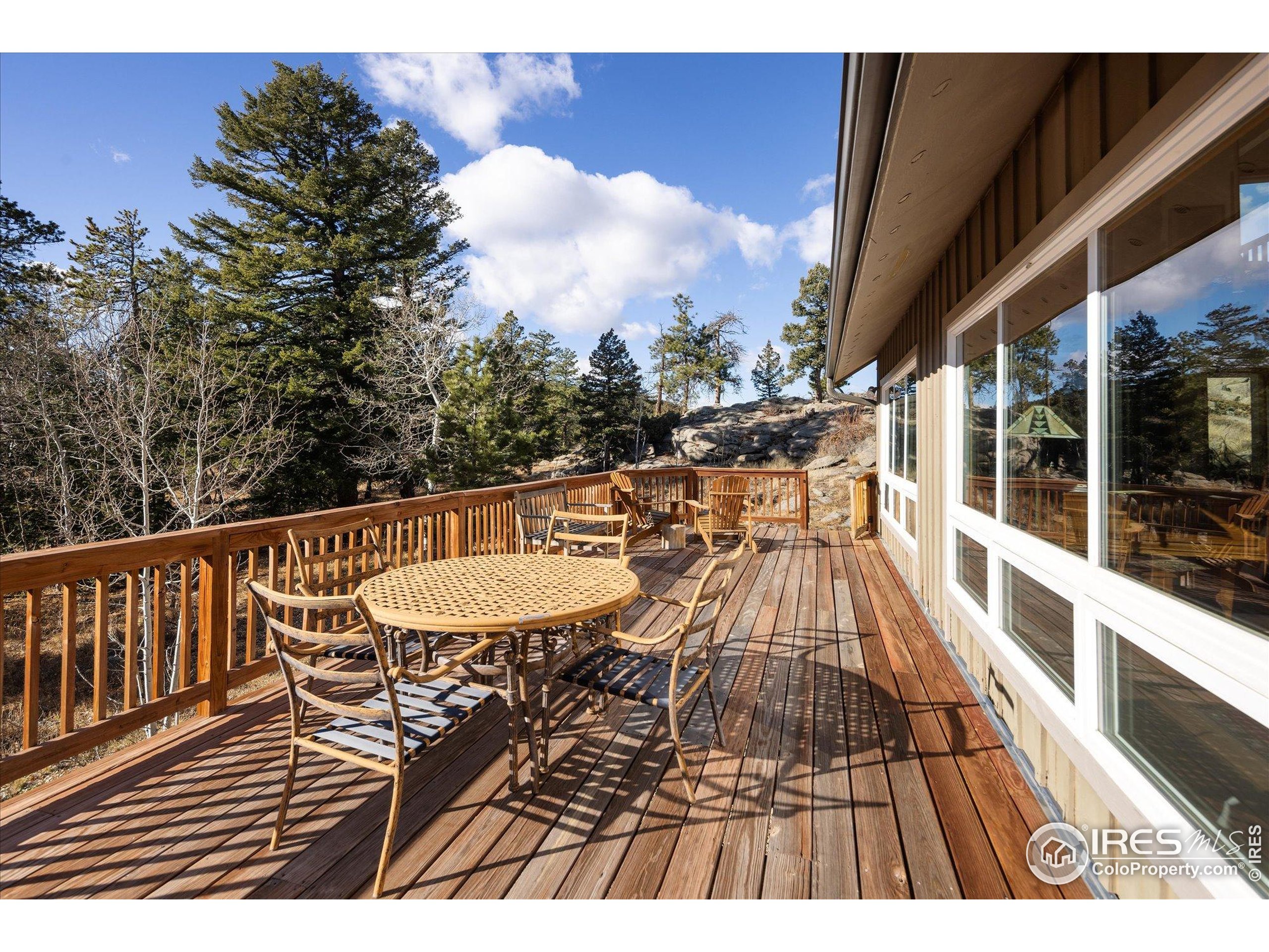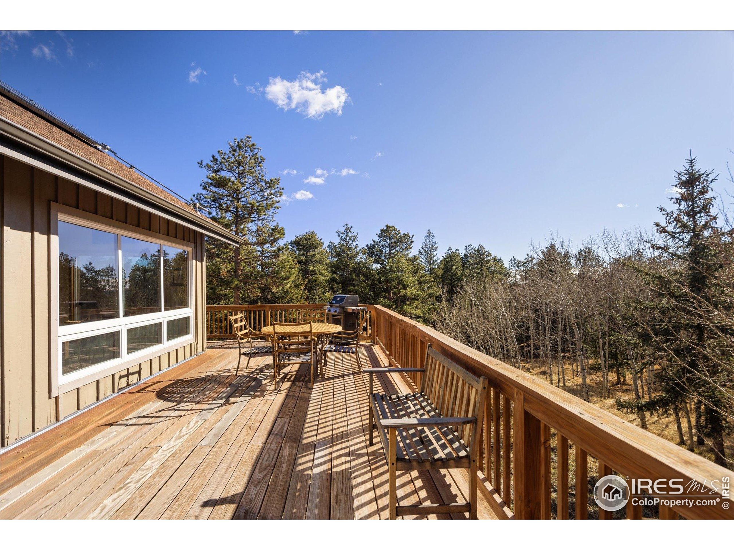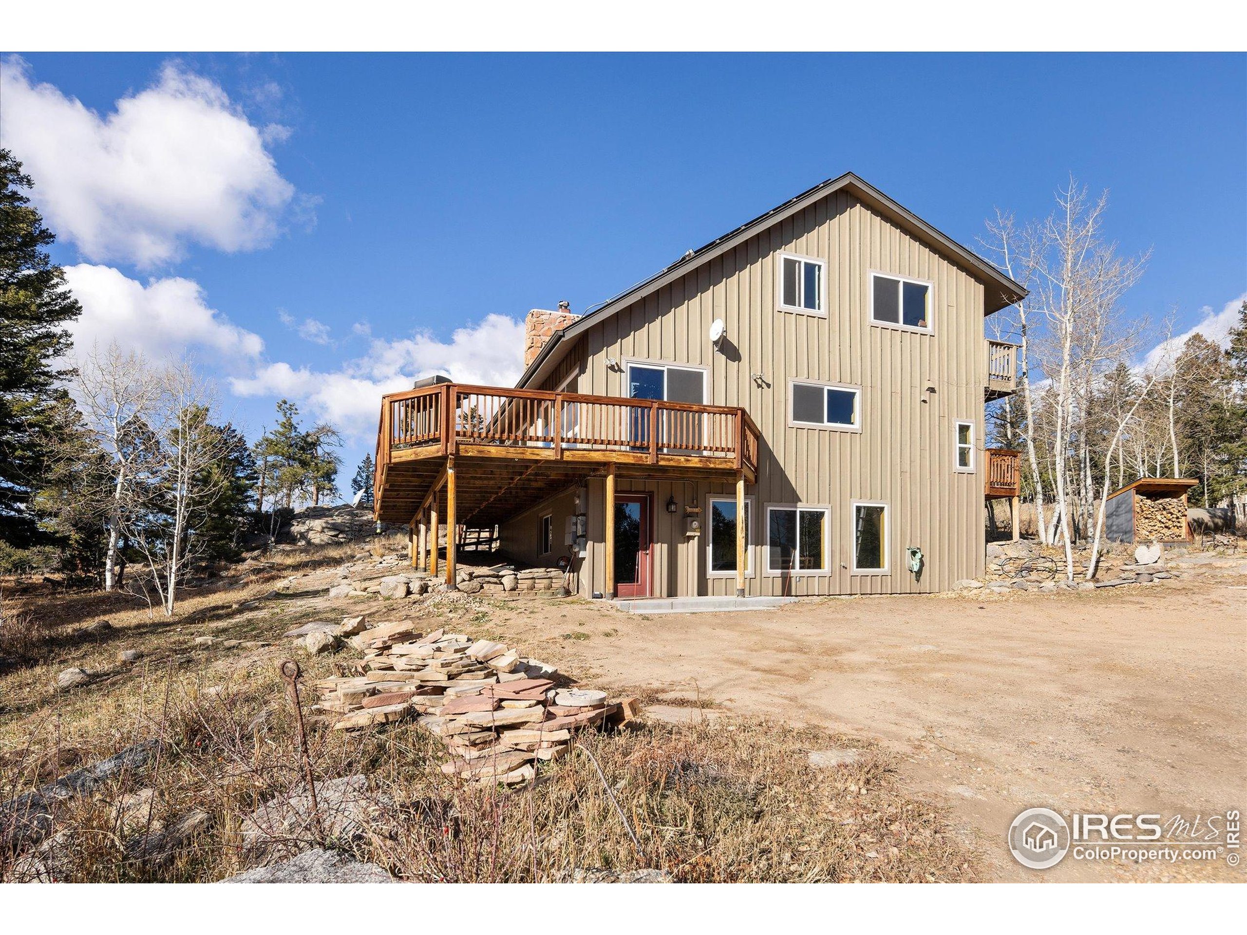 Bathed in natural light and surrounded by mature aspens and towering pines, this inviting mountain retreat offers exceptional privacy and stunning Divide views. Set against dramatic rock formations and backing to a 175-acre homestead, it provides a true Colorado mountain experience just 20 minutes from Boulder. The main level features a bright, window-filled living area with vaulted ceilings, a stone feature wall, and a wood-burning stove. The updated kitchen includes stainless steel appliances-among them a new Samsung refrigerator and new stainless steel hood-and opens to a spacious deck overlooking the landscape. A main-level bedroom offers an en-suite updated 3/4 bath and new luxury vinyl flooring. Upstairs, two bedrooms each enjoy private deck access and share a full bathroom. Wood flooring was added to both bedrooms and the office in 2022, along with new carpet on the stairs and landing. The walkout lower level provides exceptional flexibility with its own entrance, a generous living area with a gas stove, a 3/4 bath, and an additional room for office, guest space, or sleeping area. The level features new luxury vinyl flooring and fresh paint. Additional improvements include a rooftop solar system with transferable lease, a new propane furnace with whole-house humidifier (2022), a recently installed whole-house air-purifying system, and a new well pump (2025). The property offers 3-4 off-street parking spaces, ample storage and closet space, a storage shed, and a new fire-protected firewood shed with metal siding and roof. Tucked at the end of a quiet lane, this one-of-a-kind home offers peaceful mountain living with easy access to skiing, outdoor recreation, and DIA in just over an hour.