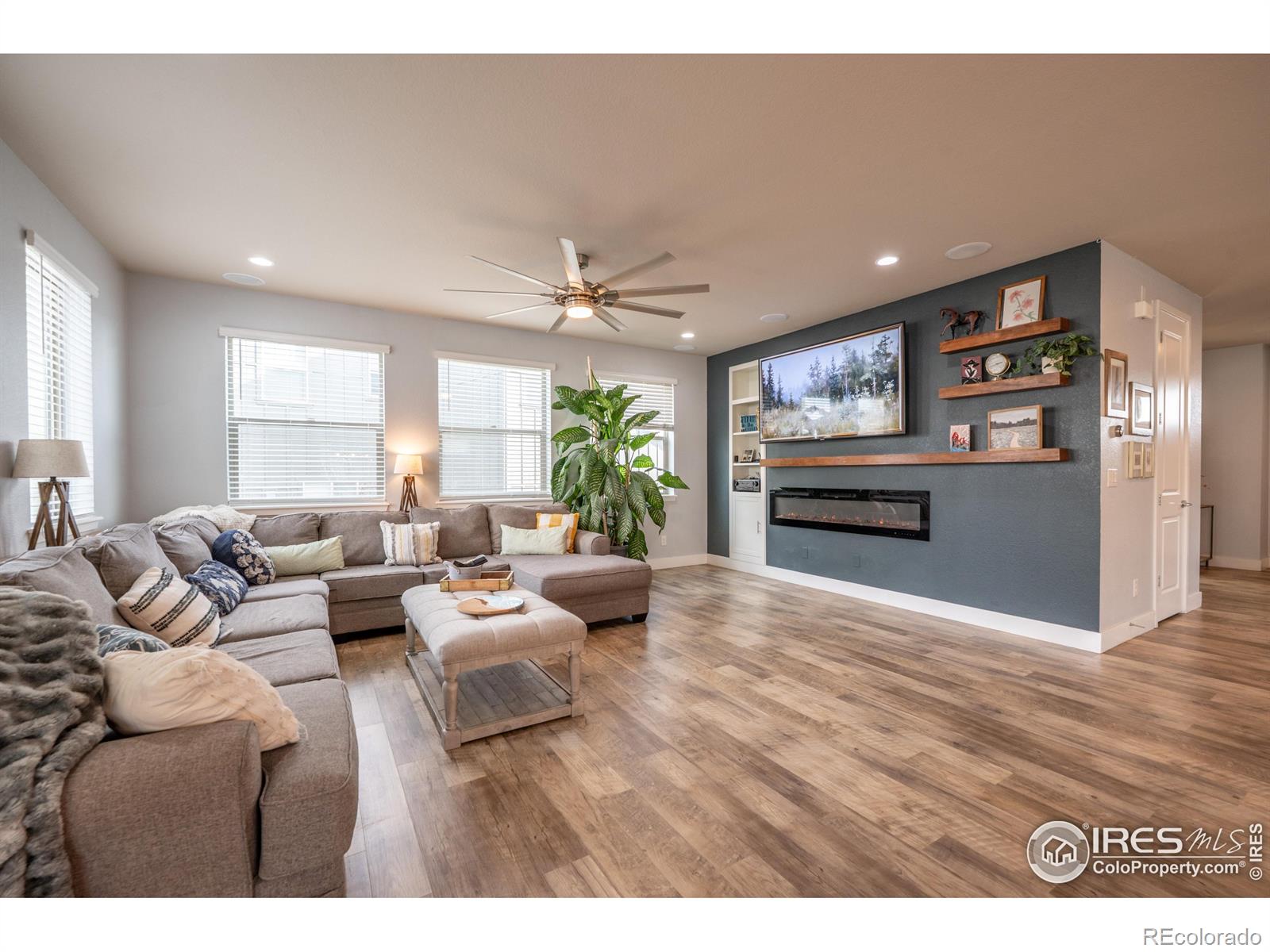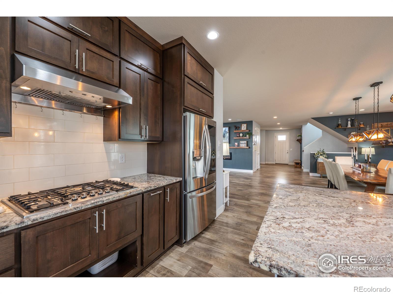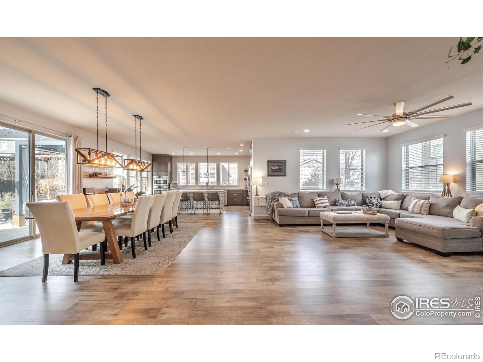 Welcome to 4593 Colorado River Drive in Firestone - a stunning Brookfield Custom built home that blends luxury, space, and effortless entertaining. From the moment you step inside, you'll notice the expansive open-concept layout flooded with natural light, soaring 8' doors, & oversized windows that create an airy, inviting feel throughout. The heart of the home is the stunning chef's kitchen, featuring Bosch and Kenmore Elite appliances, Tharp custom cabinetry, a massive center island, gas cooktop, & double ovens-perfect for hosting everything from casual gatherings to holiday dinners. Full-wall glass patio doors seamlessly connect the interior to a huge partially covered side porch, making indoor-outdoor entertaining a breeze. The main floor also offers a generous private office-ideal for working from home, along with a thoughtfully designed mudroom & extended pantry space off the 3 car garage-perfect for easy grocery drop-offs and everyday organization. The living area is anchored by a modern fireplace, custom walnut mantel & shelving, adding warmth & style. Upstairs, you'll find 3 spacious bedrooms (secondary bedrooms are separated by a wonderful jack & jill bathroom), primary suite is on the back of the home offering comfort & privacy for everyone. Primary Suite is generous with an onsite bathroom that will knock your socks off! The finished basement expands your living space even further with a large family room & fantastic dry bar-ideal for entertaining, guests. 4th bedroom & bathroom are also in the basement, plus two separate storage areas. Outside, enjoy relaxing mornings on the welcoming front porch, & spend evenings in the backyard garden area with a nicely sized yard, perfect for play, pets, or quiet downtime. This Energy Star-rated home is exceptionally well insulated, providing year-round comfort & a quiet interior. Luxury finishes, custom details, & a layout designed for both everyday living & unforgettable entertaining-this home truly has it all.