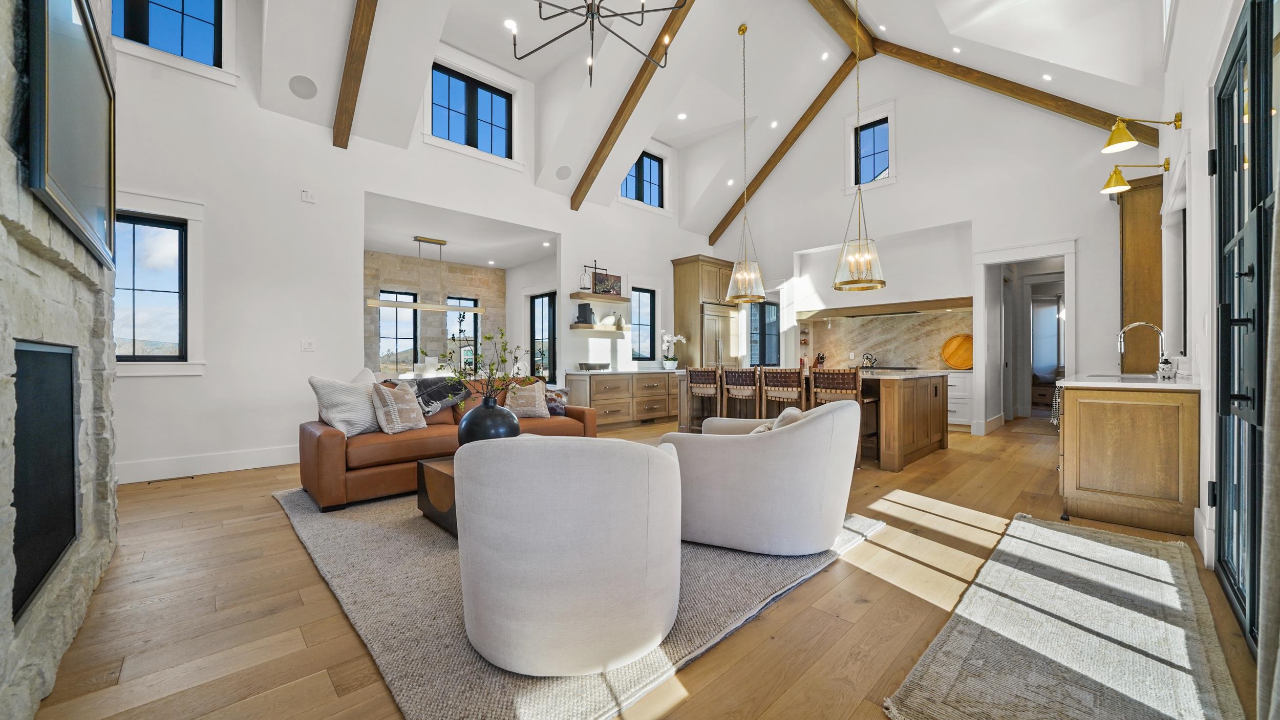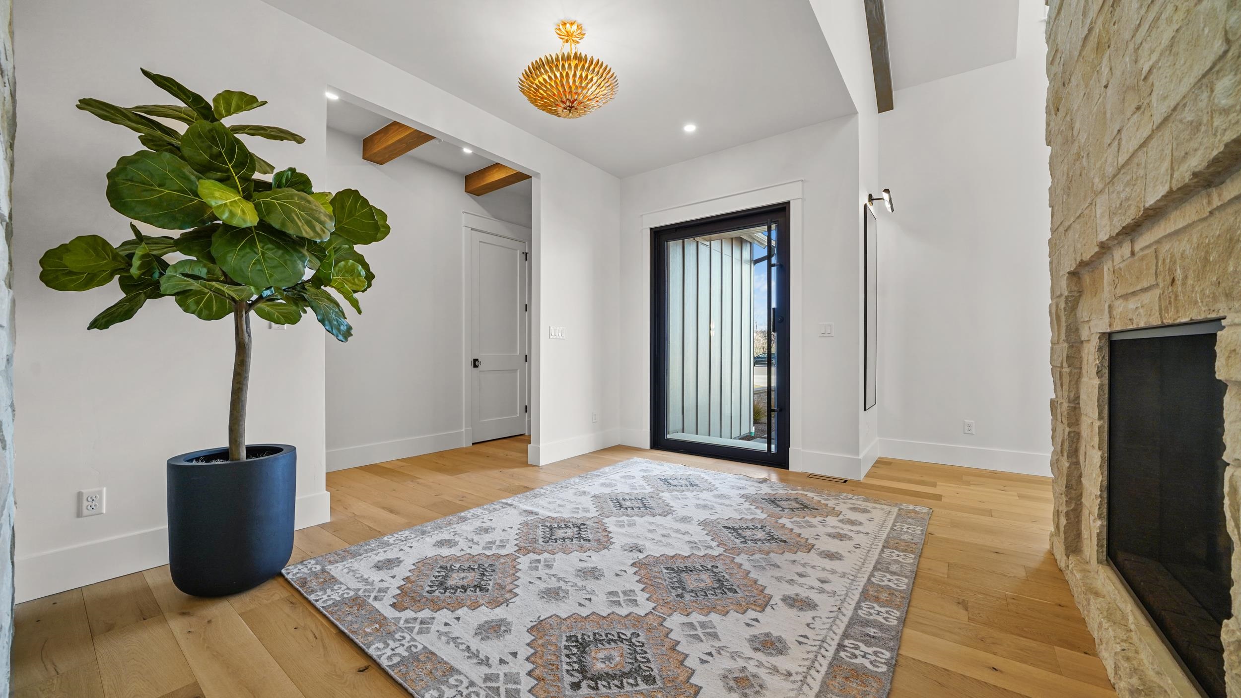 Luxury, design, and craftsmanship converge in this nearly new custom residence by an innovative builder, still under full builder warranty. Set on just over one acre with sweeping Monument views and mature trees, the home features a striking James Hardie board-and-batten exterior, standing-seam metal roof, and all-natural Telluride stone. Architecturally designed entry walls with accent lighting, curated landscaping with custom night lighting, a U-shaped drive and real-wood fireplace patio create an impressive arrival and refined outdoor living. The open-concept interior is anchored by a dramatic two-way custom stone gas fireplace, seamlessly connecting the living, dining, and kitchen spaces. Vaulted and beamed ceilings, floor-to-ceiling stone accent walls, Kentwood wide-plank hardwood flooring, and extensive custom millwork elevate the home throughout. The gourmet kitchen is a true centerpiece, featuring a Sub-Zero and Wolf appliance suite, a single-slab Taj Mahal stone island, custom hood and backsplash, designer fixtures, and a butler pantry with wine refrigerator. The primary suite is a serene retreat with custom feature walls and iron double doors providing access to a motorized screened patio overlooking the Monument. The spa-inspired bathroom showcases a custom Victoria and Albert 2-person bathtub, separate vanities and a Kohler bidet. Guest suites and a flex space offer private baths, built-ins, and designer lighting. Additional highlights include Andersen windows with factory UV protection, dual HVAC systems, integrated ceiling speakers in key living areas and patios, a comprehensive security system, an approximately 1,100-square-foot three-car garage with epoxy floors and overhead storage, and a matching storage shed. A rare opportunity to own a meticulously crafted luxury home in one of Grand Junction’s most scenic settings.